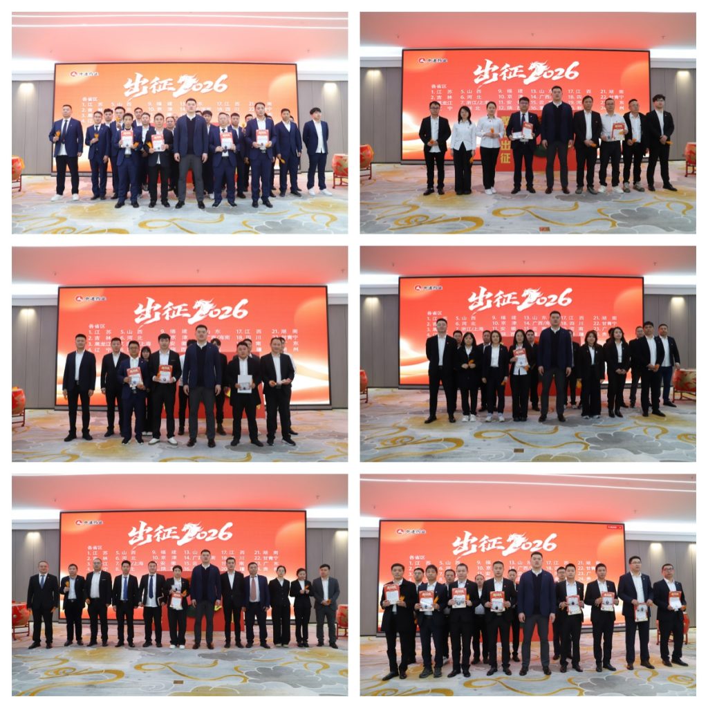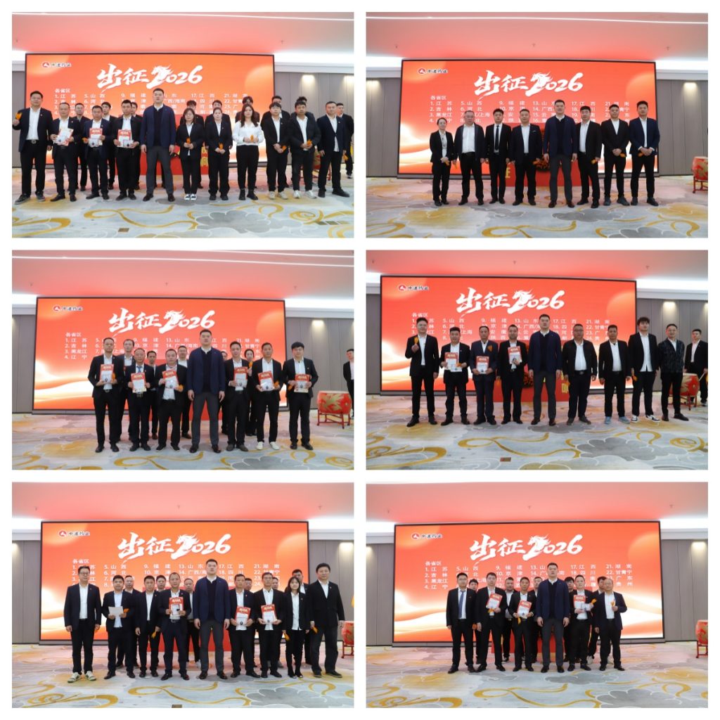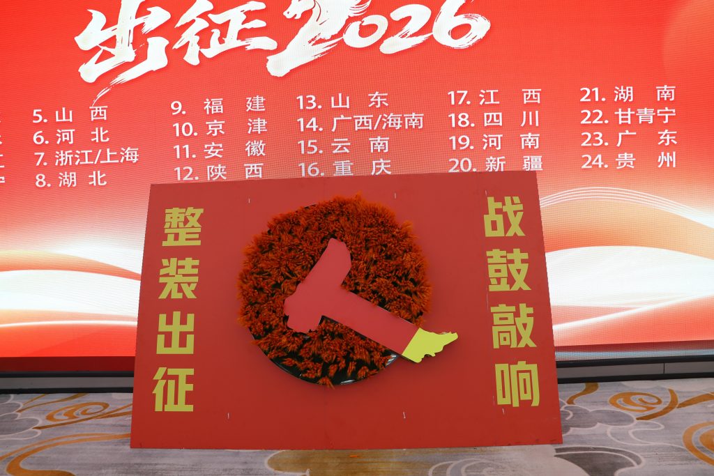 儀式進入最高潮——擊鼓出征環(huán)節(jié)震撼上演。銷售管理部部長熊迪凱揮槌擊鼓,三聲鼓響如春雷炸裂,振奮人心。各省區(qū)團隊回聲嘹亮,口號震天,鼓聲與吶喊交織成出征的號角。全體將士邁著堅定有力的步伐,正式踏上2026年的嶄新征程。