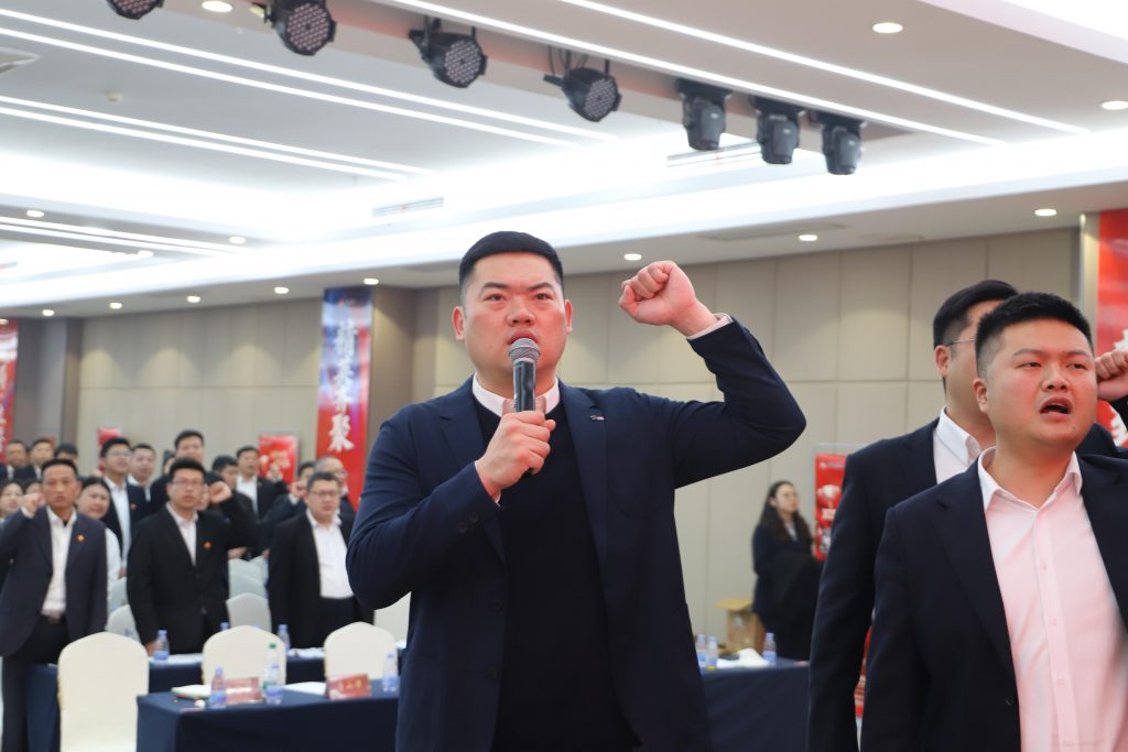 儀式在主持人劉永權(quán)莊重而富有感染力的開場中拉開帷幕,現(xiàn)場氣氛瞬間點燃。在各省區(qū)整齊列隊的見證下,公司總經(jīng)理李圳帶領(lǐng)全體市場營銷將士高舉右拳,莊嚴宣誓。誓言錚錚,響徹全場,這不僅是對年度目標的堅定承諾,更是中進鐵軍勠力同心、使命必達的精神宣言。
